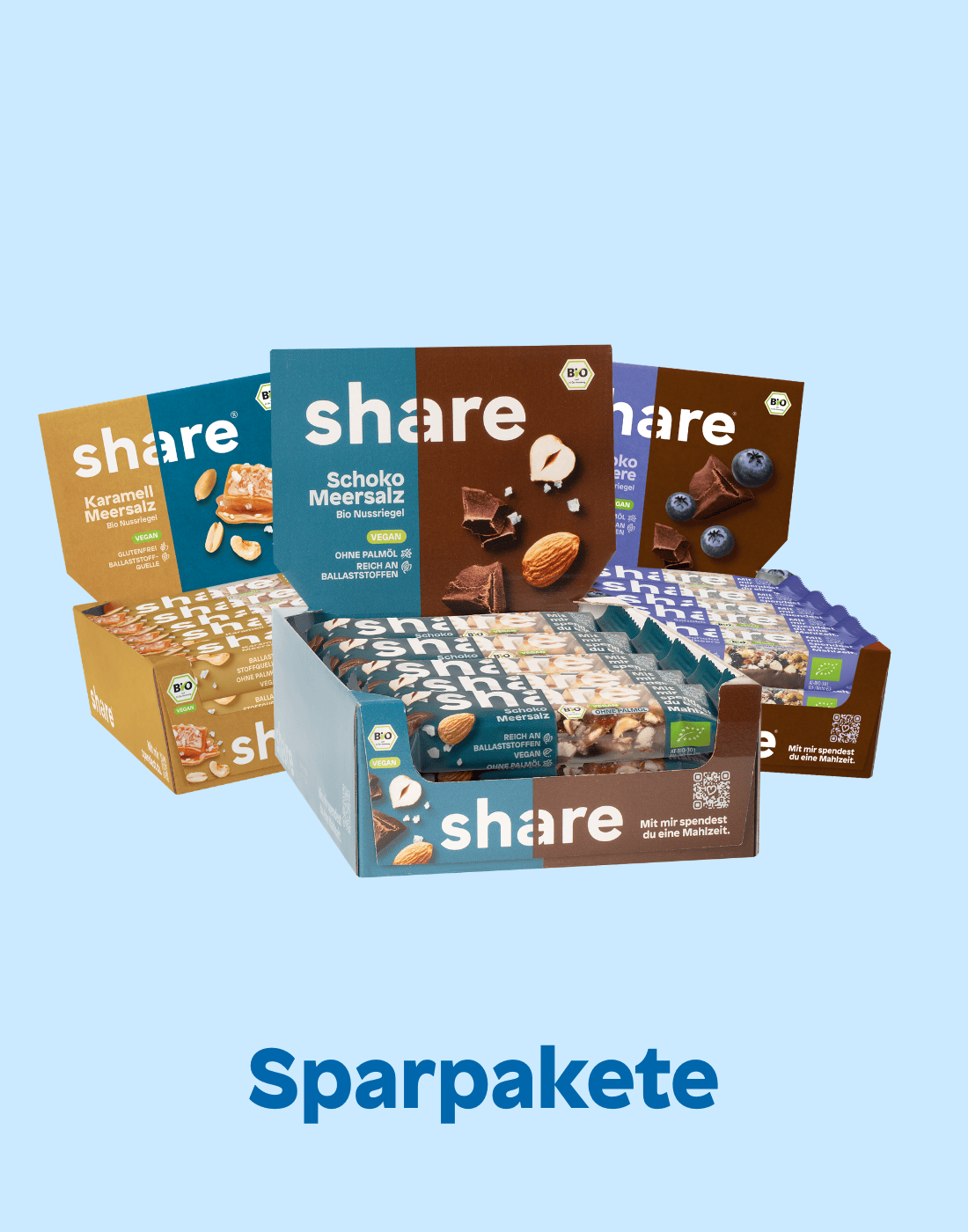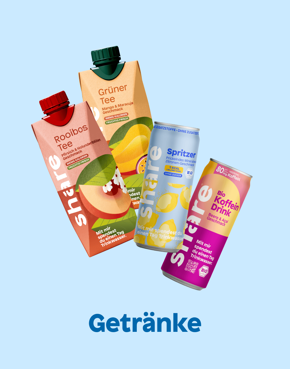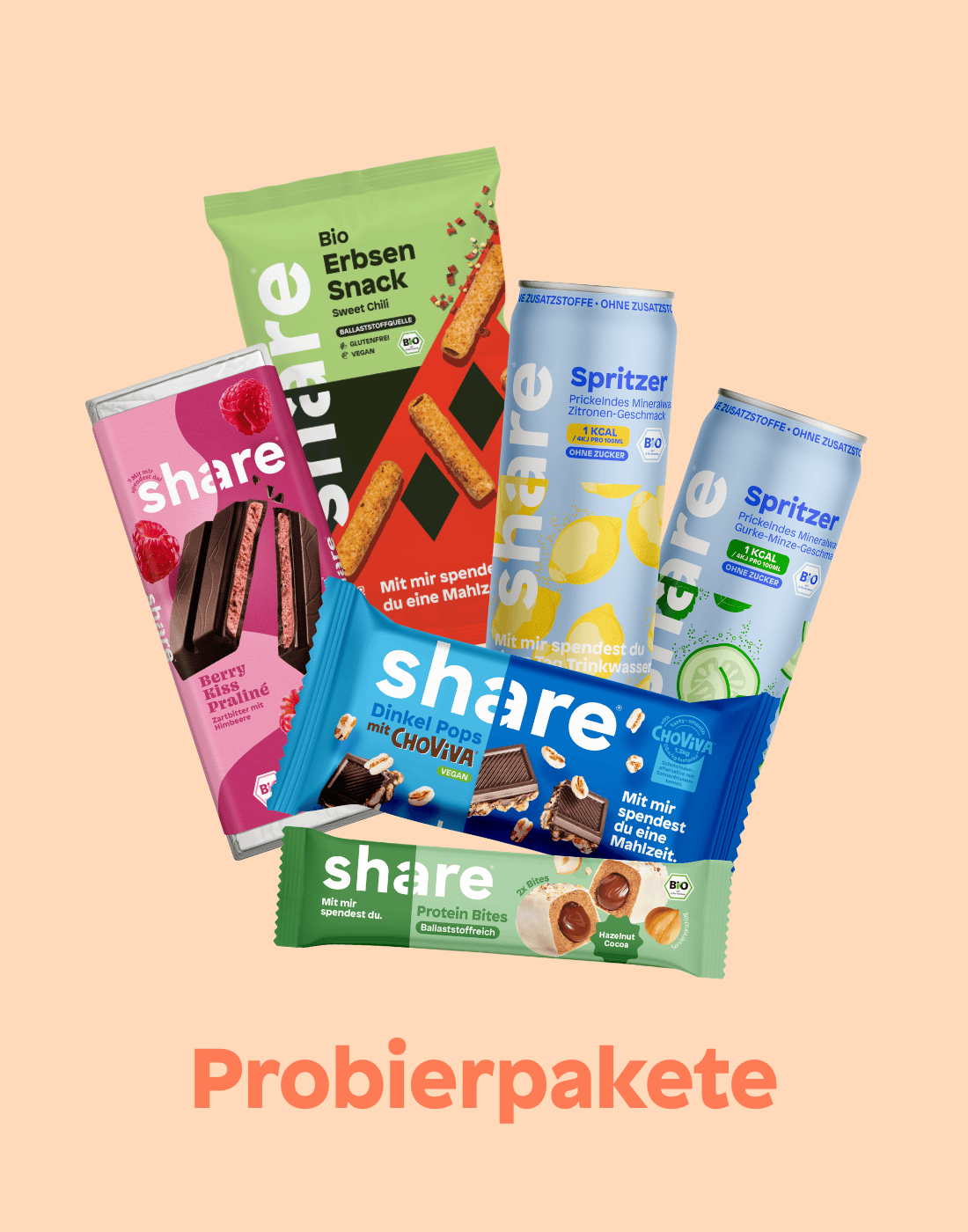 2018 gründeten die Freund:innen Sebastian, Ben, Iris und Tobias share – deine soziale Marke, bei der jedes Produkt eine Spende beinhaltet. Angefangen mit einem Wasser, einem Riegel und einer Seife sind wir mittlerweile bei über 100 Produkten, die es dir ermöglichen, täglich Gutes zu tun.