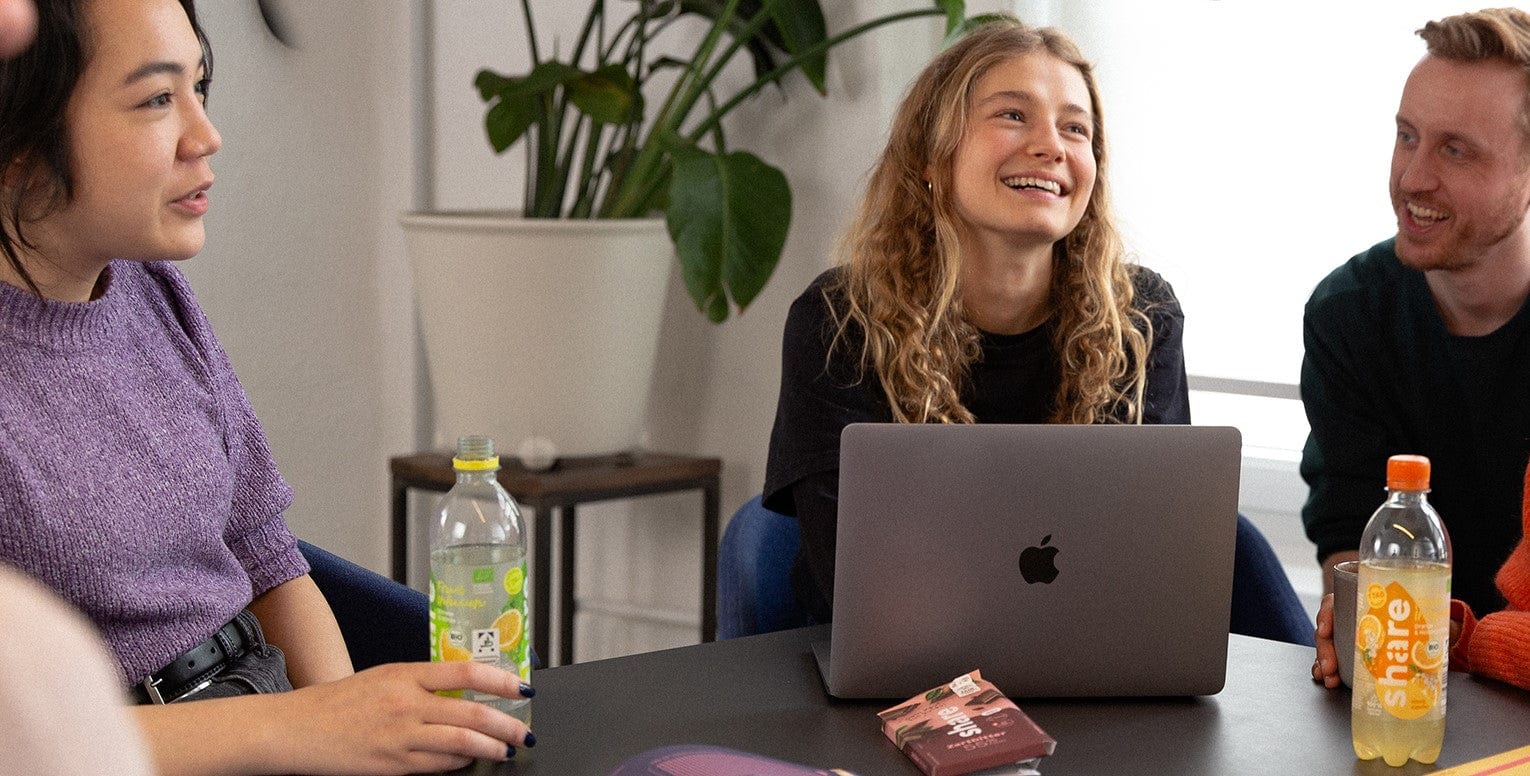 If you fancy spending time in the office, you are of course very welcome! In our beautiful office in Berlin Kreuzberg , you will find great colleagues, the usual supply of fruit and drinks + lots of share snacks . Above all, the supply of our favorite bar - chocolate sea salt - is full to bursting. Of course, you will also find the typical start-up table tennis table .
