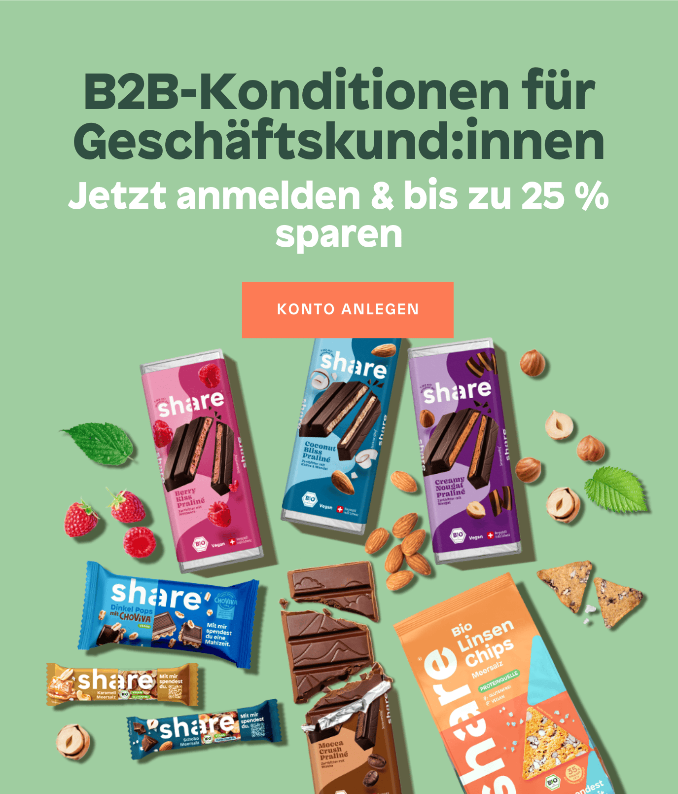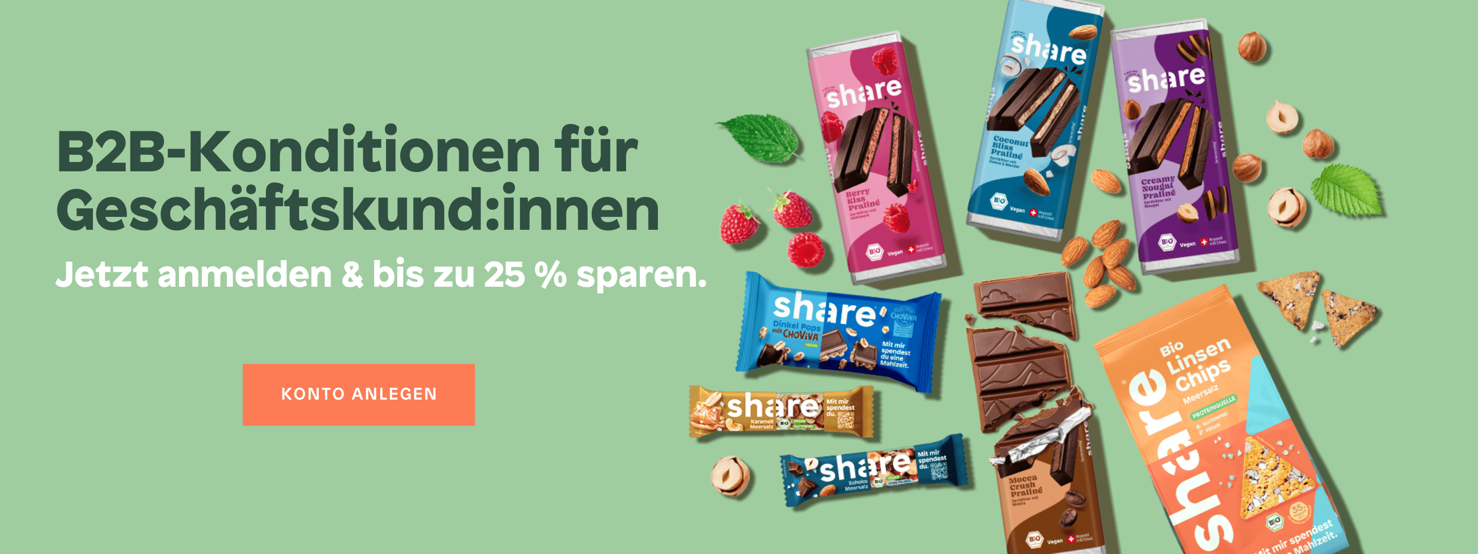 Bring Bewegung ins Regal mit Produkten, die heute gefragt sind: bio, vegan, better-for-you und vor allem richtig lecker. share bietet dir Trendprodukte mit starkem Social Impact, die Kund:innen nicht nur kaufen, sondern bewusst wählen. Unsere Snacks und Drinks punkten mit ehrlicher Qualität, nachhaltigen Zutaten und einer Geschichte, die verbindet.