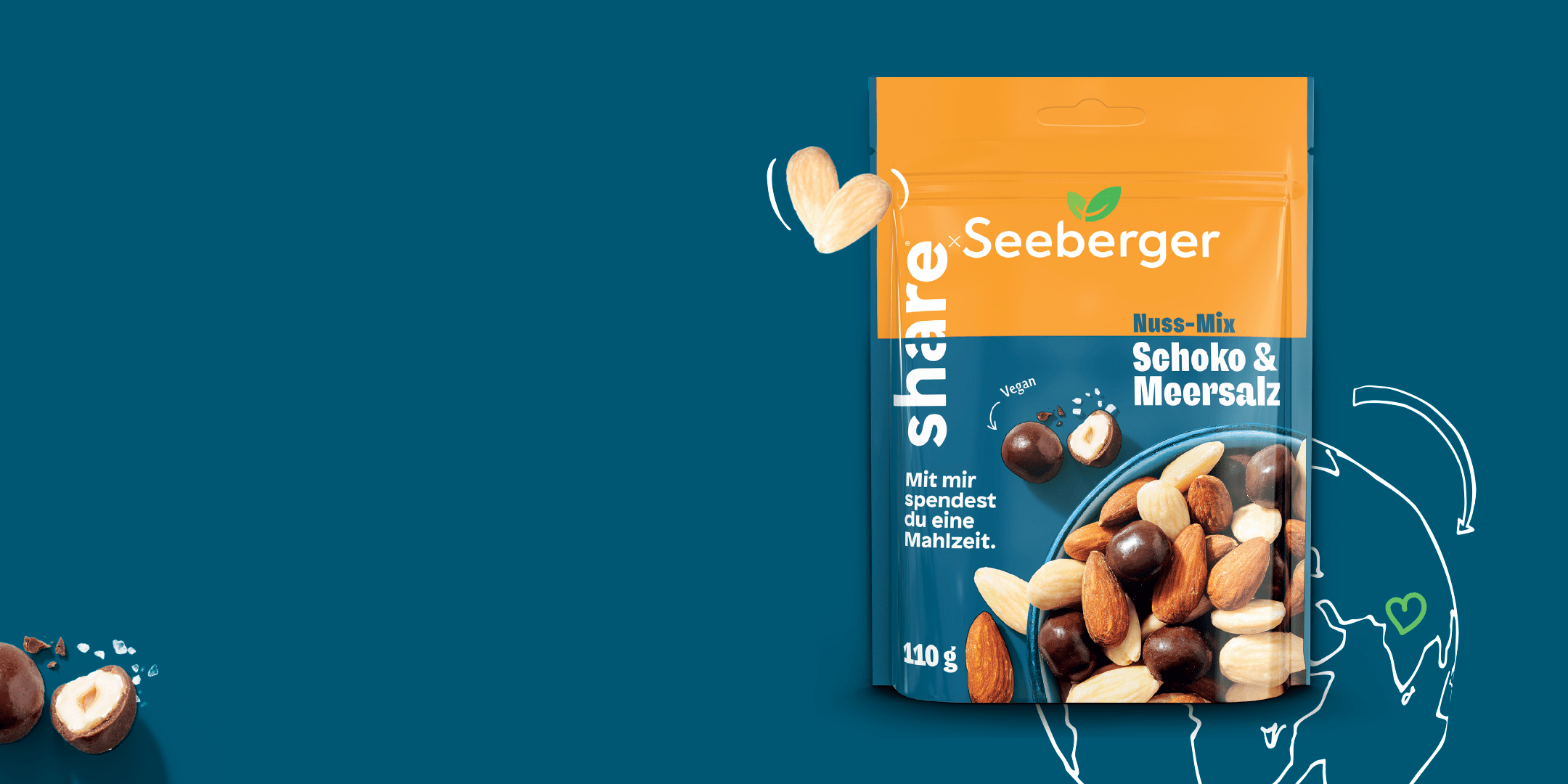 Knackige geröstete Salzmandeln – teilweise blanchiert -, treffen auf Haselnüsse, überzogen mit feiner Zartbitterschokolade – das ist unser neuer Seeberger x share Nuss-Mix Schoko & Meersalz.