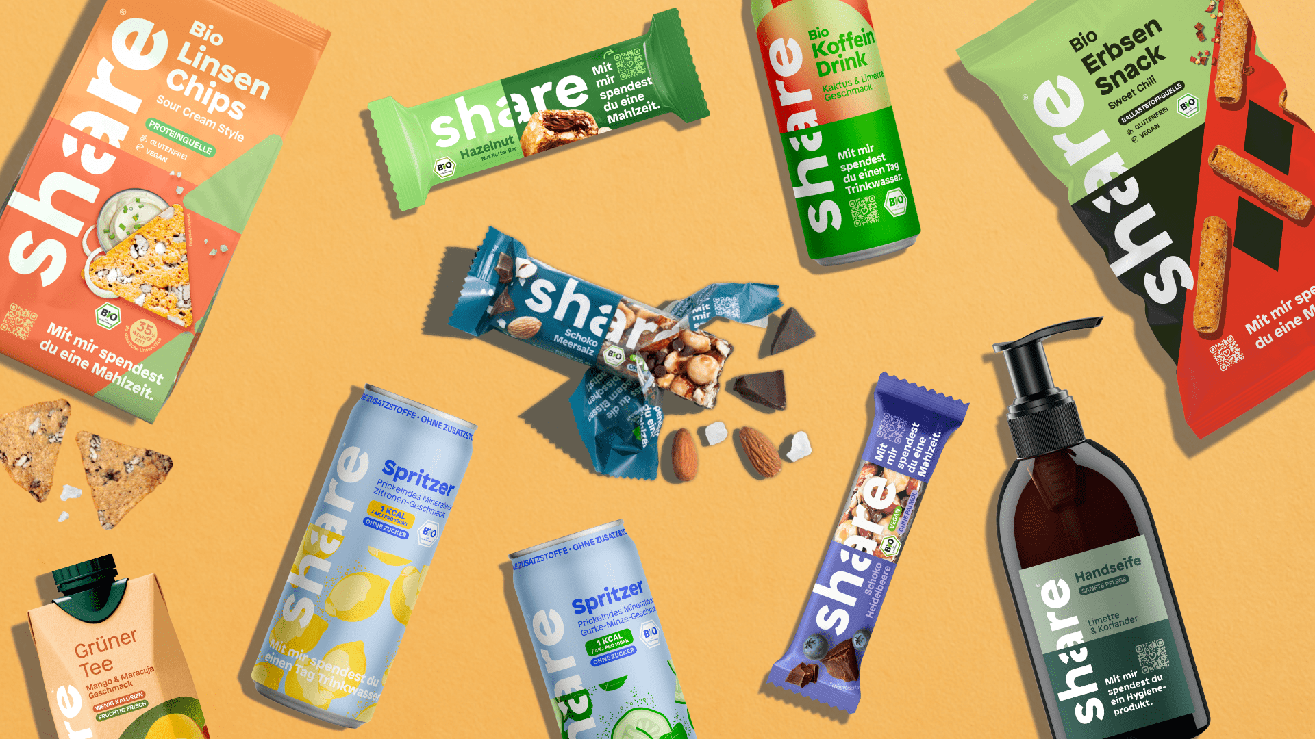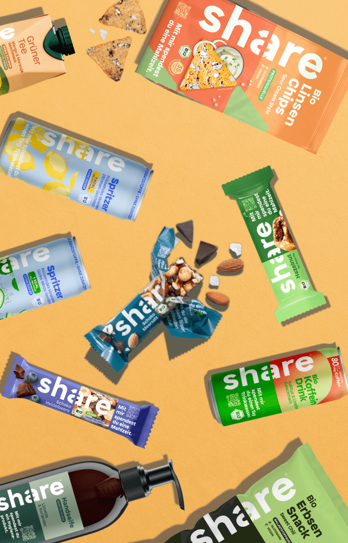 2018 starteten Sebastian, Ben, Iris und Tobias share, um Menschen weltweit zu unterstützen. Heute sind wir ein zertifiziertes B Corp-Unternehmen, das für soziale und ökologische Verantwortung steht. Aus einem Wasser, einem Riegel und einer Seife wurden viele weitere tolle Produkte, die zeigen: Jede kleine Wahl kann Großes bewirken.